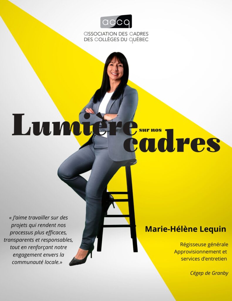 Dans la poursuite du déploiement de la campagne de valorisation, l’ACCQ publiera de façon hebdomadaire une rubrique intitulée PORTRAIT DE CADRE, et ce, jusqu’à la tenue de la première journée des cadres des cégeps qui se déroulera le 24 avril prochain. Une dizaine de gestionnaires en provenance de divers cégeps et œuvrant dans différents secteurs d’activité seront en lumière. Apprenez-en un peu plus sur ces personnes engagées qui ont accepté de répondre à quelques questions. Cette semaine, nous vous invitons à découvrir Marie-Hélène Lequin, gestionnaire dans le réseau collégial depuis 2019.